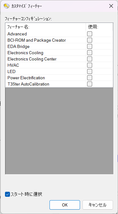 〈☑スタート時に選択〉としていただくと、FLOEFDの起動と同時にカスタマイズフィーチャーも併せて開く設定にすることができます。